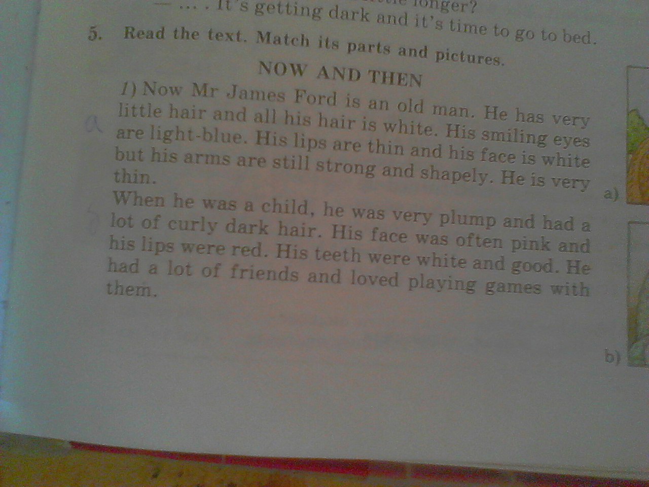 1) Сейчас мистер Джеймс Форд старый. У него очень короткие волосы и они все белые/седые. Его улыбающиеся глаза светло-голубые. Его губы тонкие и его лицо белое, но его руки все еще сильные и приятно выглядят. Он очень тонкий/худой.