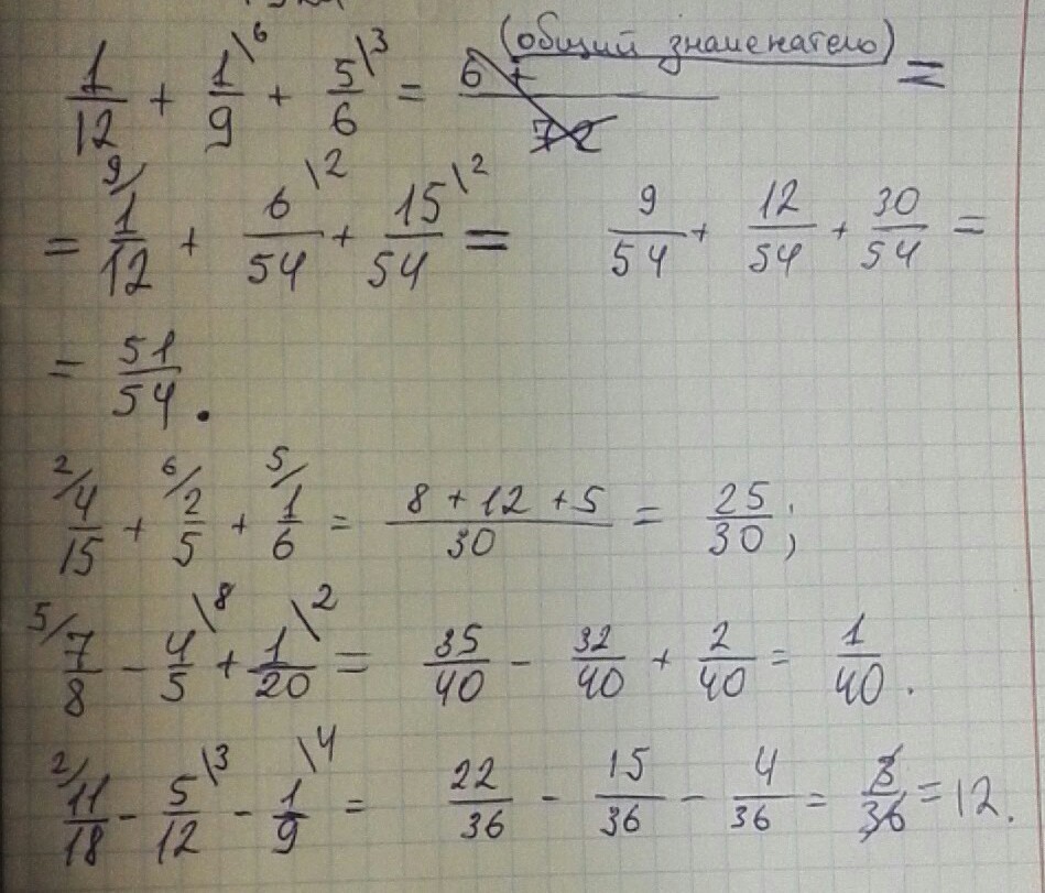 1/12+1/9+5/6 ; 4/15+2/5+1/6; 7/8-4/5+1/20; 11/18-5/12-1/9 Спасибо огромное)))С объяснениями пожалуйста))Срочно нужно...