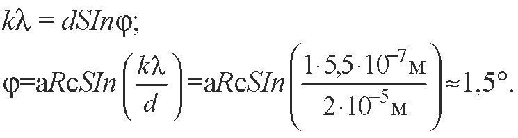 определите угол отклонения лучей зеленого цвета (лямбда =0,55 мкм) в спектре первлго порядка, если дифракционная решетка содержит 500 штрихов на 1мм