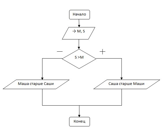 Составьте алгоритм, по которому на компьютере будет происходить следующее: в переменную S вводится возраст Саши, в переменную М вводится возраст Маши. В качестве результата на экран выводится фраза «Саша старше Маши» или «Маша старше Саши» (предполагаем, что кто-нибудь из них обязательно старше)