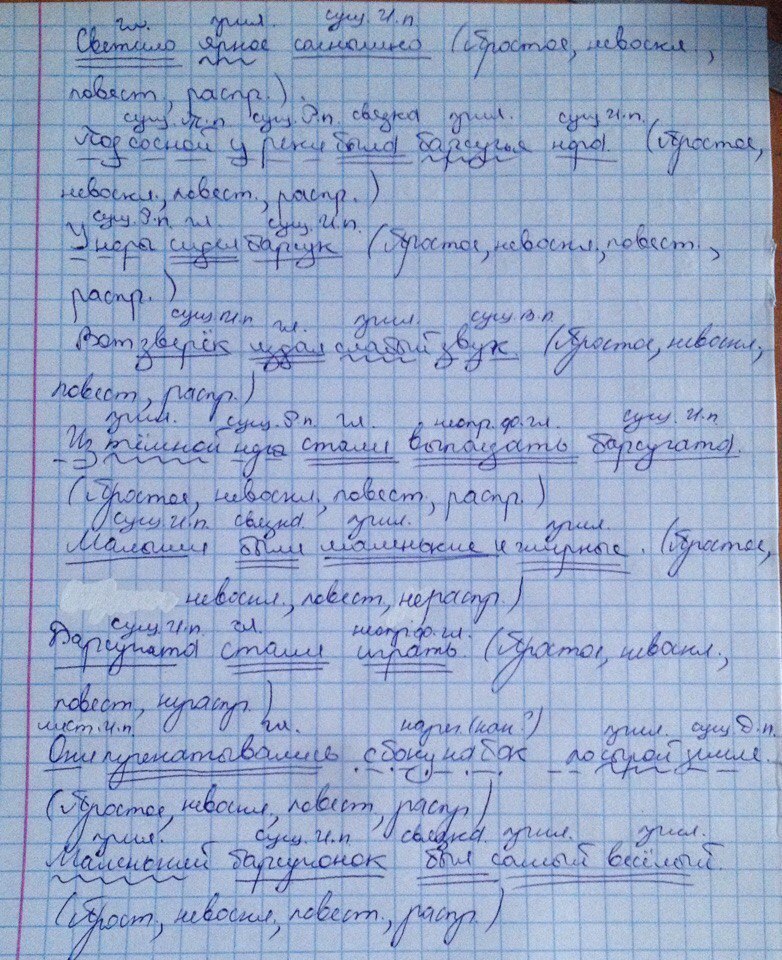 Светило яркое солнышко. Под сосной у реки была барсучья нора. У норы сидел барсук. Вот зверек издал слабый звук. Из темной норы стали выползать барсучата.Малыши были маленькие и жирные. Барсучата стали играть. Они перекатывались с боку на бок по сырой земле. Маленький барсучонок был самый весёлый.Сделать синтак-й разбор предложений