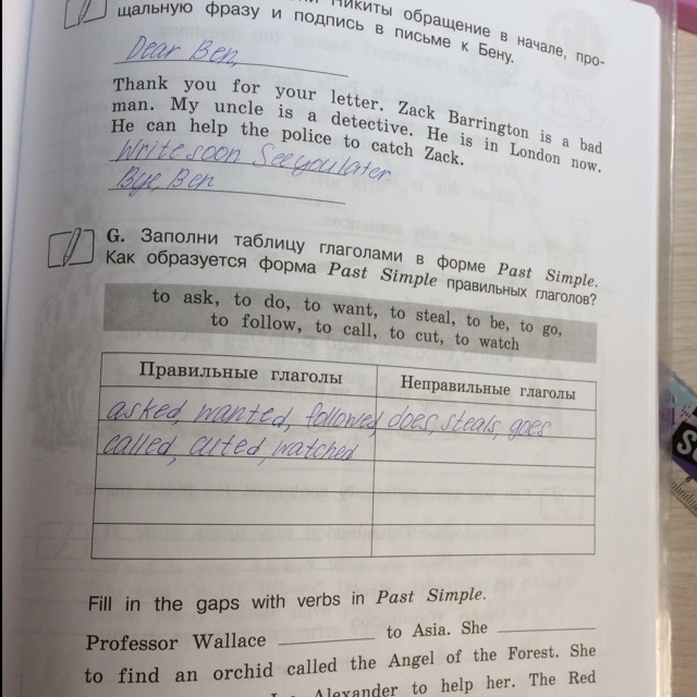 Правильные глаголы: asked, wanted ,followed, called,watched.Неправильные глаголы: did,stole,was/were,went,cut.