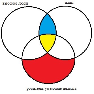 Помогите решить С помощью кругов Эйлера постройте схему, на которой кругами обозначьте три множества: множество всех высоких людей; множество всех пап; множество родителей, умеющих плавать. Подпишите эти множества.