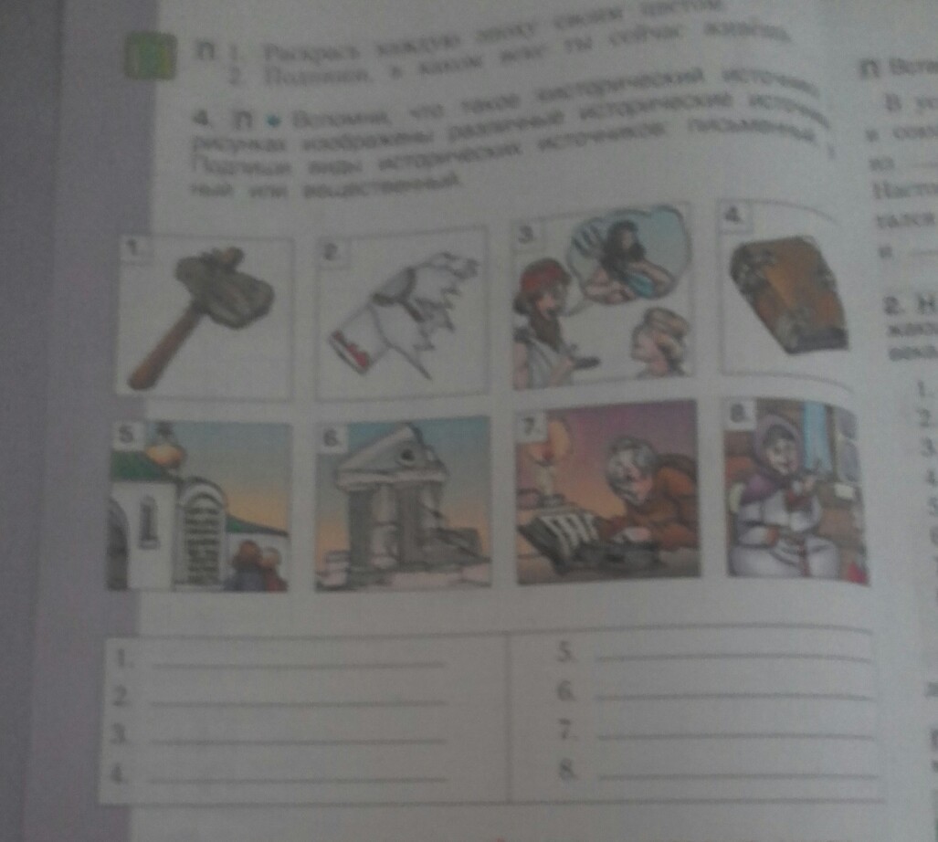 Вспомни , что такое <<Исторический источник >>. На рисунках изображены различные исторические источники . Подпиши виды исторических источников : письменный , устный или вещественный .