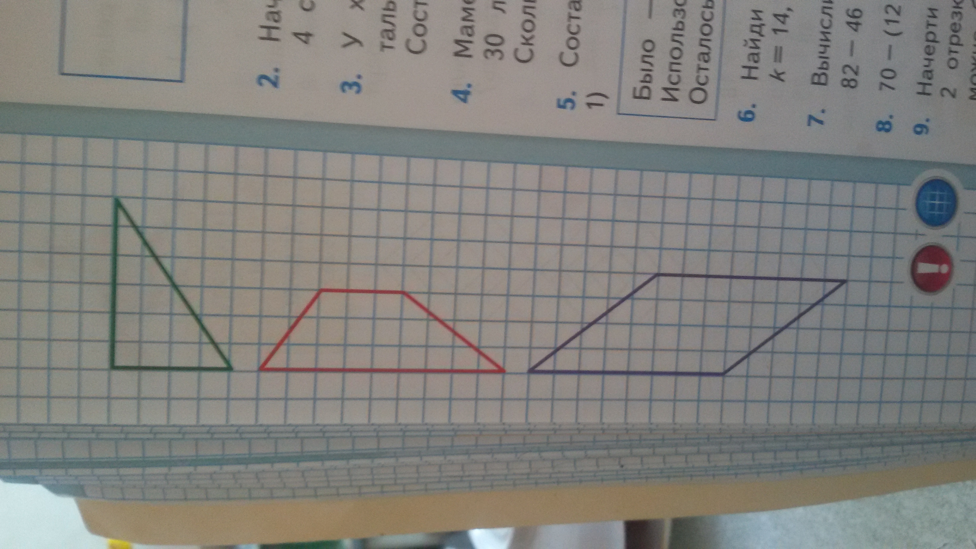 начерти фигуры и проведи в каждой 2 отрезка так,чтобы,разрезав по ним фигуры,можно было бы получить в каждом случае 1 прямоугольник и 2 треугольника