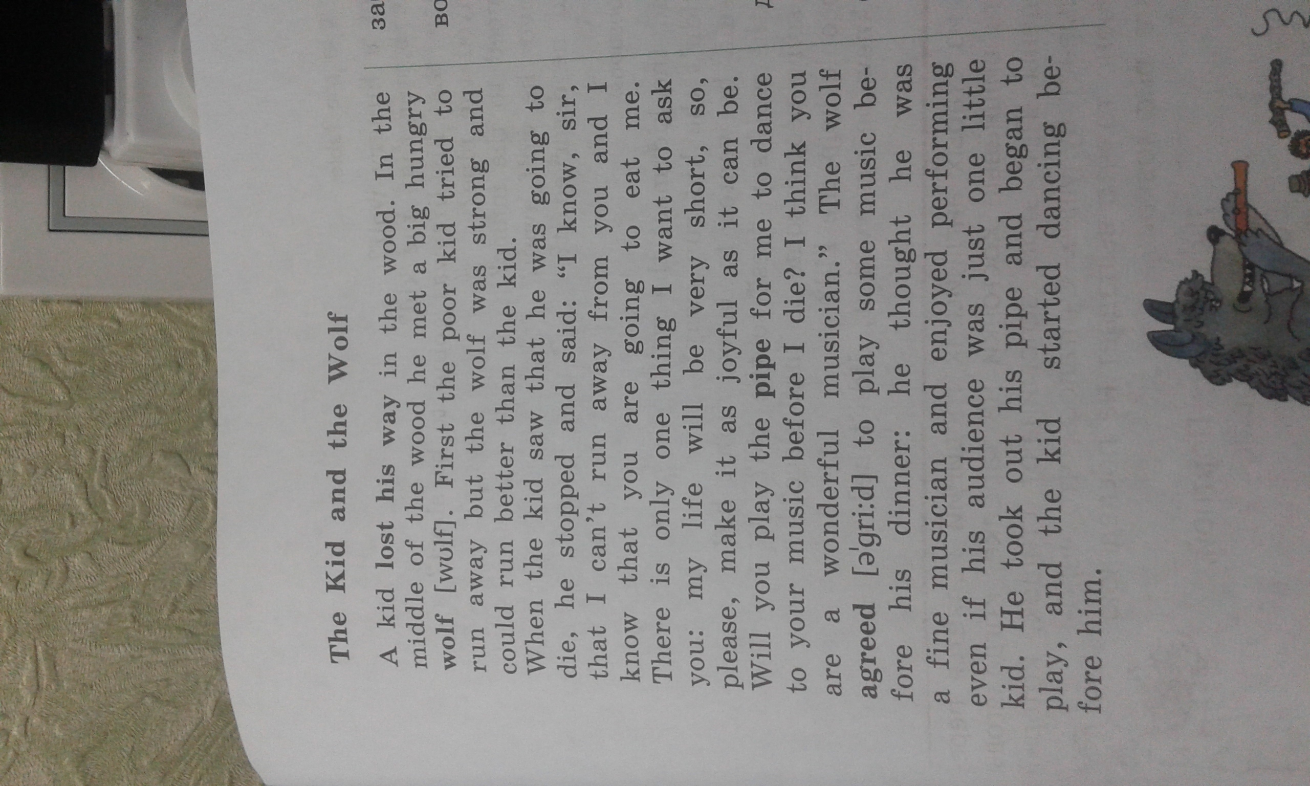 Когда ребенок увидел что он собирается умирать, он остановился и сказал: Я знаю, сер, я не могу убежать от тебя и знаю что ты собираешься меня съесть. Только я хочу попросить у тебя одну вещь: моя жизнь будет очень короткой, так, пожалуйста сделай ее радостной настолько, насколько это возможно. Ты сыграешь на трубе для меня, чтобы я мог станцевать под твою музыку до того как я умру. Я думаю ты прекрасный музыкант. Волк согласился сыграть немного музыки до своего ужина. Он думал, что он отличный музыкант и наслаждался исполнением, даже если его аудиторией был только один маленький ребенок. Он достал свою трубу и начал играть, а ребенок начал танцевать перед ним.
