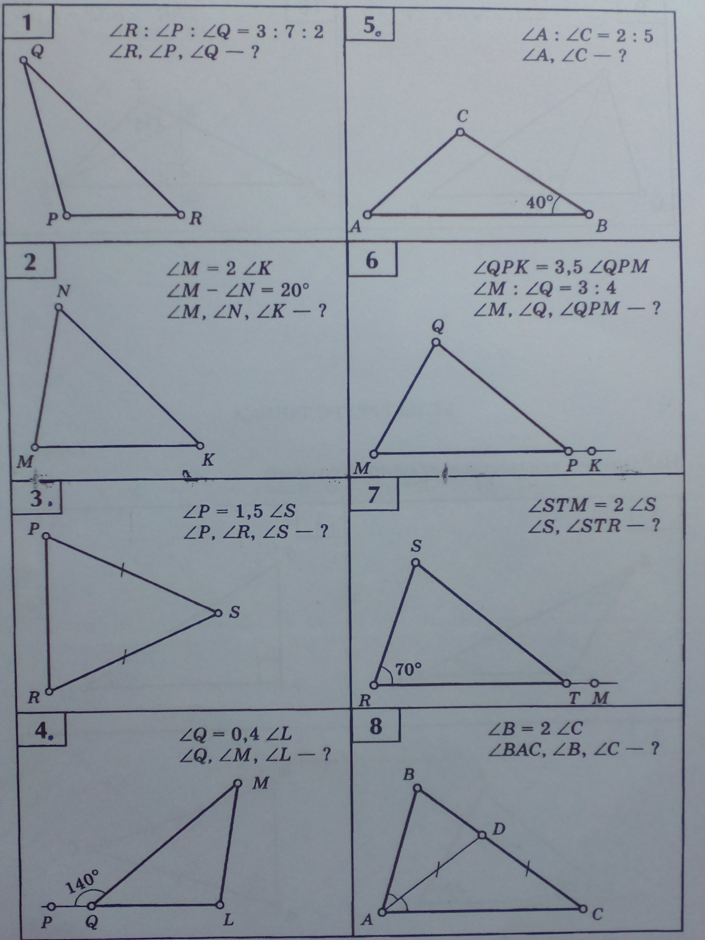 4)∠Q=180-140=40°;∠L=∠Q/0.4=40/0.4=100°; ∠M=180-100-40=40°
