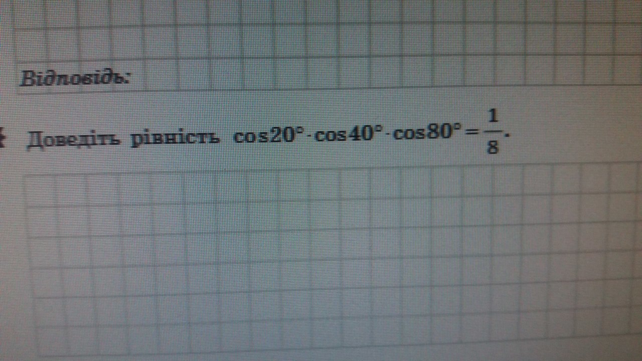 Чтобы вычислить значение произведения косинусов от аргументов , образующих геометрическую прогрессию со знаменателем q =2, полезно это произведение умножить и разделить на синус наименьшего аргумента и затем применяя последовательно несколько раз формулу 2sinαcosα=sin2α (⇔sinα*cosα = (1/2)*sin2α ) свернуть его. * * *20° , 40°, 80° составляют геометрическую прогрессию: q =2. * * *
