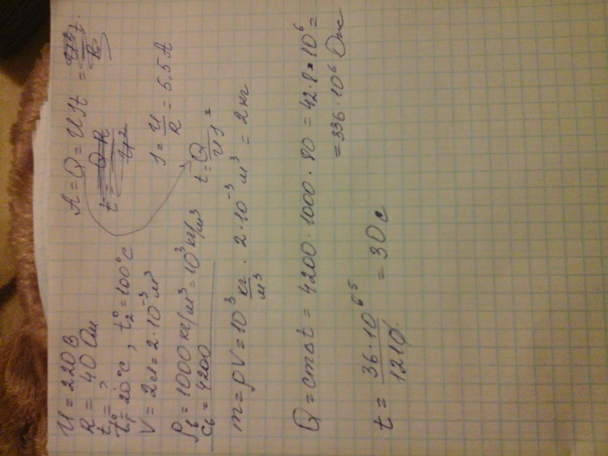 Сопротивление спирали электрической плитки , включенной в сеть напряжением U=220 B,R=40 Ом . Через какой промежуток времени на этой плитке закипит в кастрюле вода , температура которой t=20°C , a объем V=2,0 л? Коэффициент полезного действия плитки n=60 %. Теплоемкостью кастрюли пренебречь .