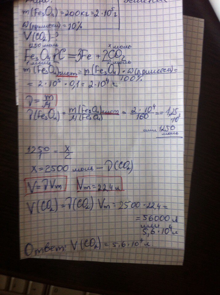 Вычислите объём (н.у.) оксида углерода (4), полученного при полном восстановлении углём железной руды (Fe3O4) массой 200 кг, содержащей 10% примесей