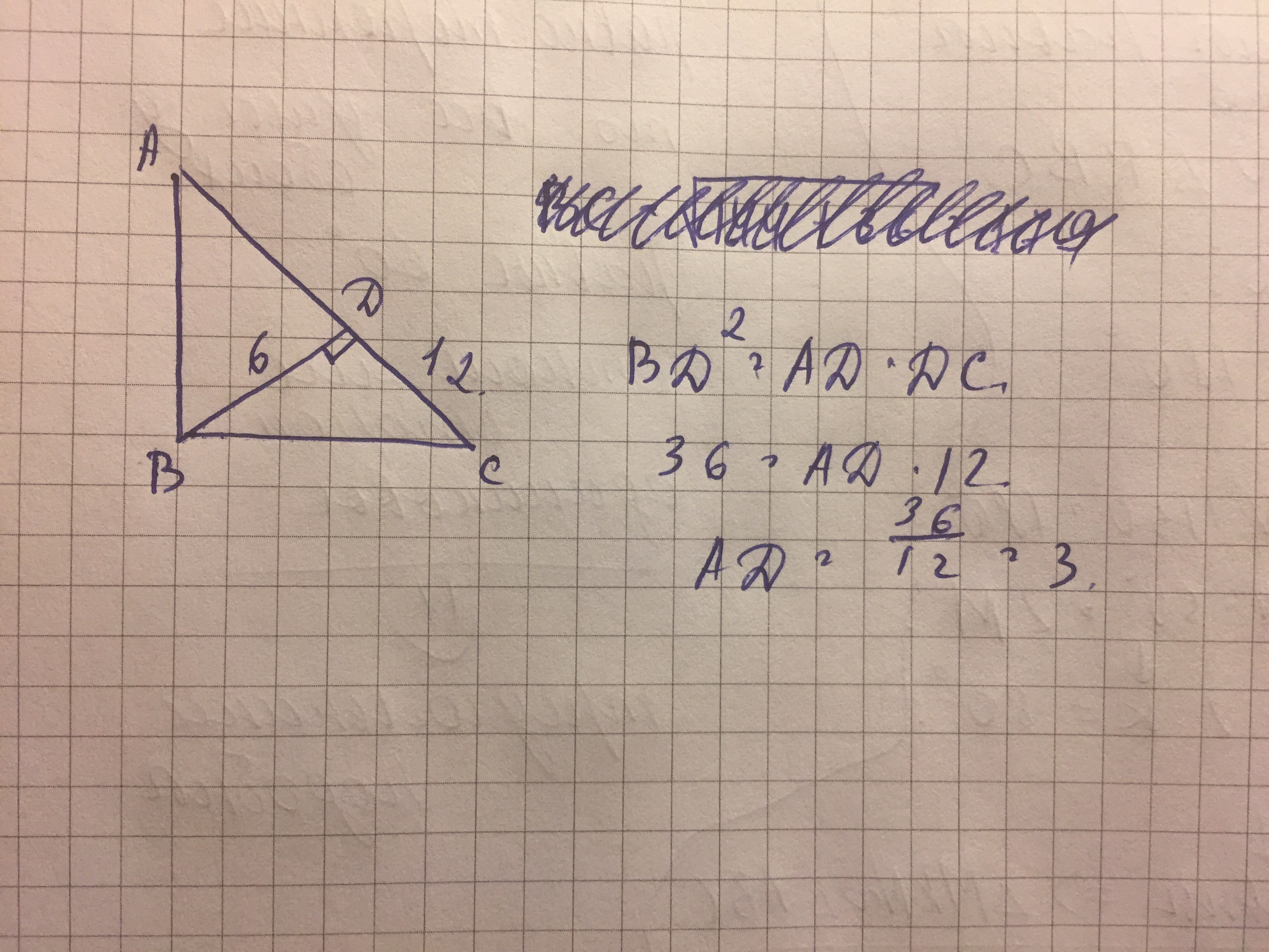 Из вершины прямого угла B прямоугольного треугольника ABC проведена высота BD. Найдите длину отрезка AD если BD=6,DC=12