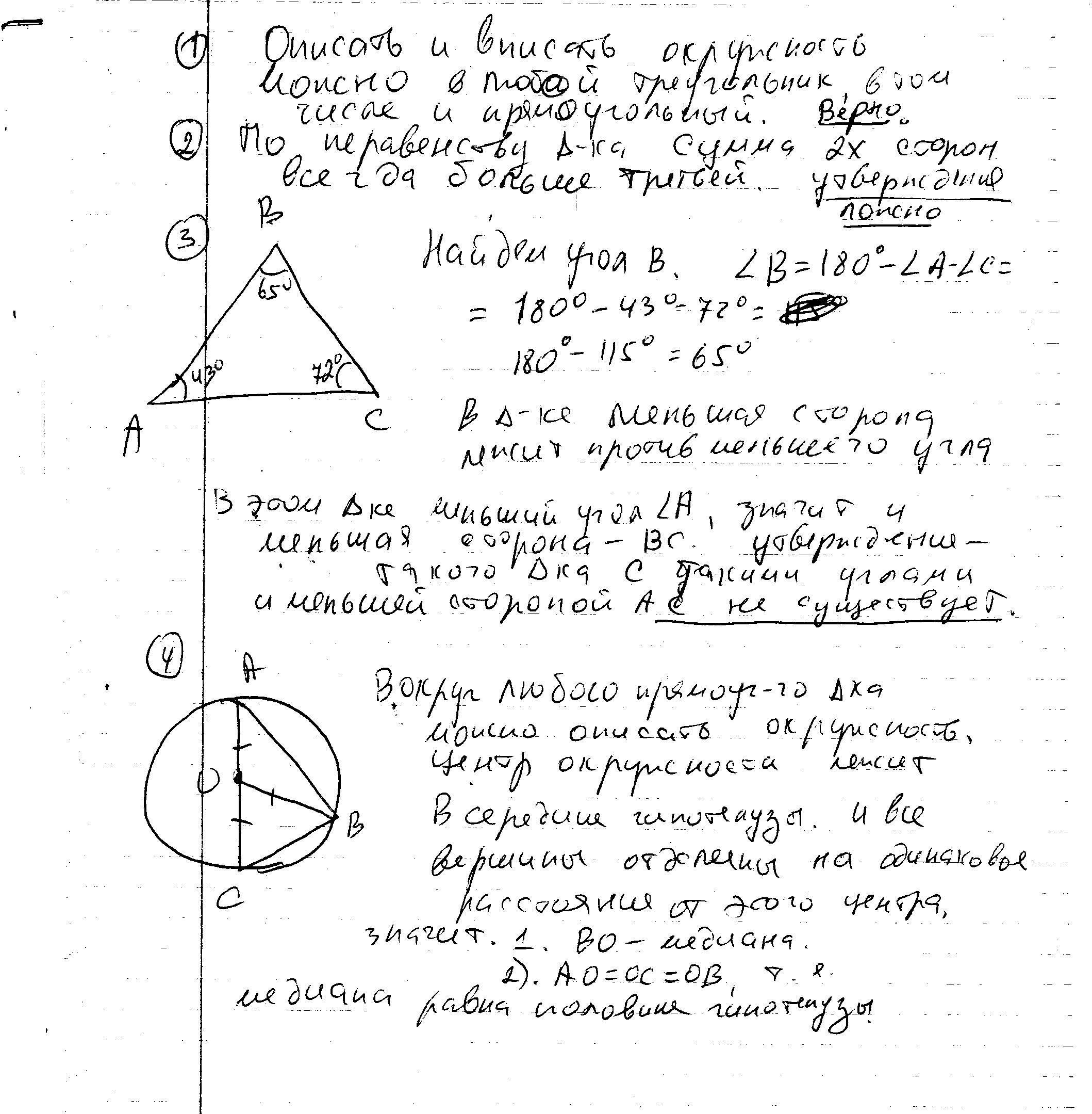 Какие из следующих утверждений верны? В любой прямоугольный треугольник можно вписать окружность. Каждая сторона треугольника больше суммы двух других сторон. Существует треугольник ABC с меньшей стороной AC и углами ∠A=43∘, ∠C=72∘. Медиана, проведенная к гипотенузе прямоугольного треугольника, равна половине гипотенузы. Любые два равнобедренных треугольника подобны.
