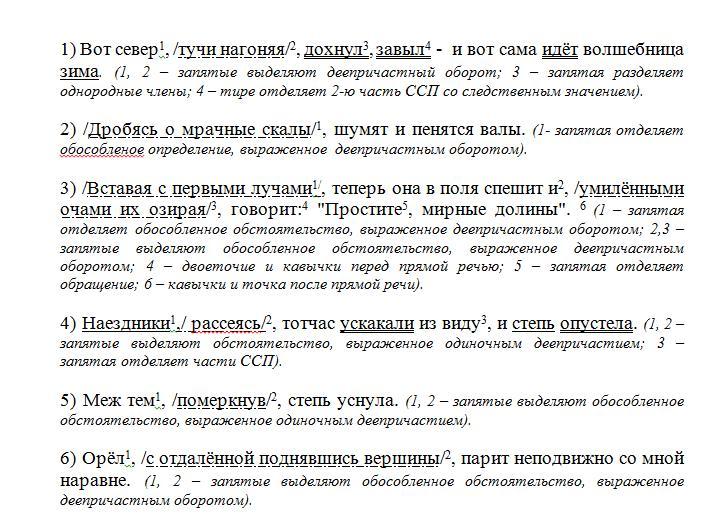 1) Вот север тучи наг_няя дохнул завыл и вот сама идёт волшебница(зима). 2) Др_бясь о мрачные скалы шумят и пеня(тся, ться) в…лы. 3) Вствая с первыми лучами теперь она в поля сп_шит и ум…лё(н, нн)ыми очами их оз_рая говорит Простите мирные д…лины. 4) Наез_ники ра(с, сс)еясь тот(час) уск_кали из виду и степь опустела. 5) Меж тем померкнув степь уснула. 6) Орёл с отд…лё(н, нн)ой поднявшись в_ршины парит (не, ни)подвижно со мной нар…вне. 7) Дождь лил ровно и однообразно шумя по траве и деревьям. 8) И (не, ни)пуская тьму ночную на золотые небеса одна з_ря см…нить другую сп…шит дав ночи (пол)часа. 9) Добрый ком…ндант с согласия своей супруги решил осв…бодить Швабрина. 10) Возвратясь со псарного двора Кирила Петрович сел уж…нать. 11) Савелич дремля к…чался на облучке. (А.Пушкин)