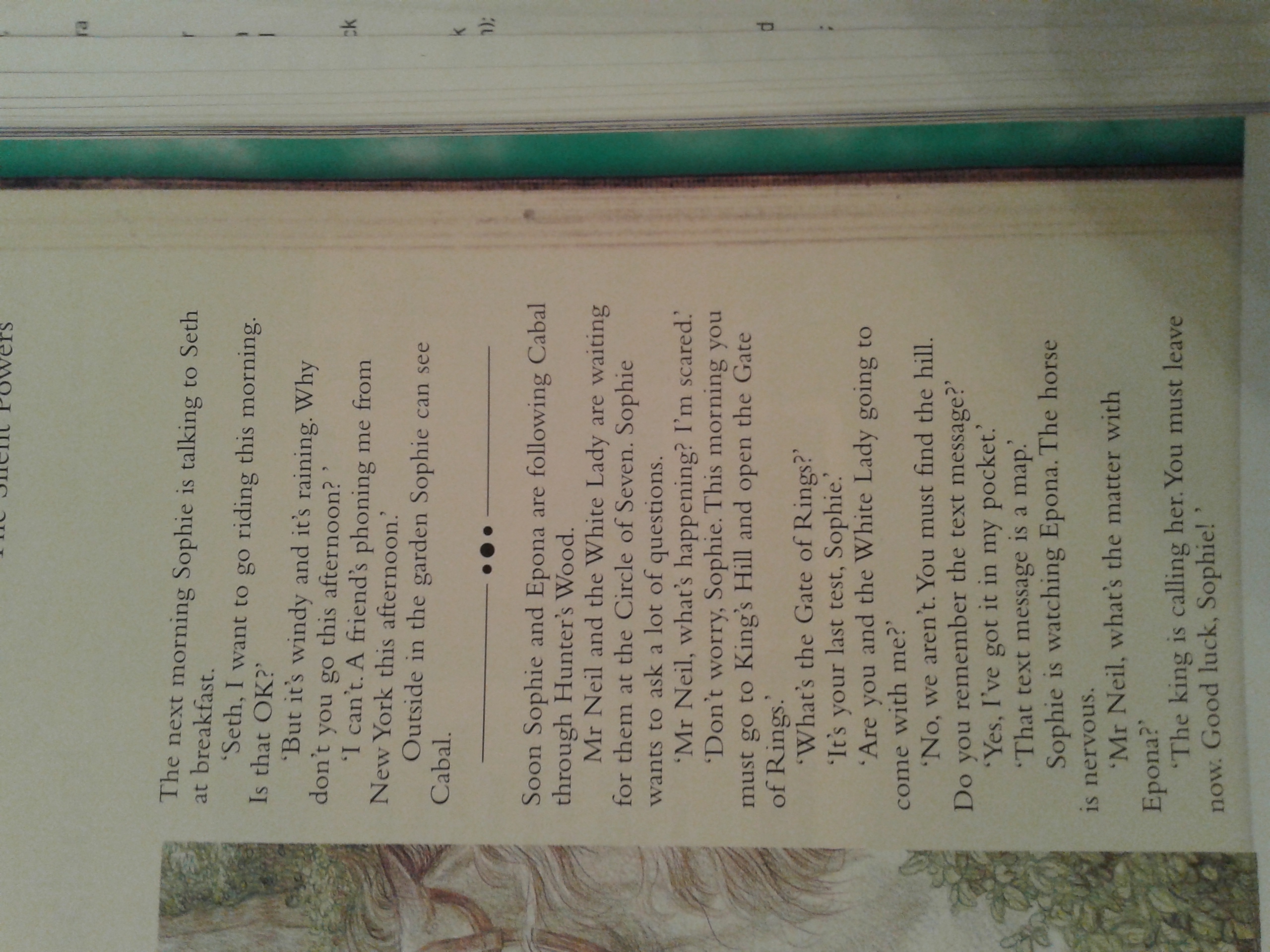 «Это текстовое сообщение - карта.» Софи наблюдает за Эпоной, лошадь нервничает. Мистер Нейл, что случилось с Эпоной? «Царь зовет ее. Удачи, Софи!