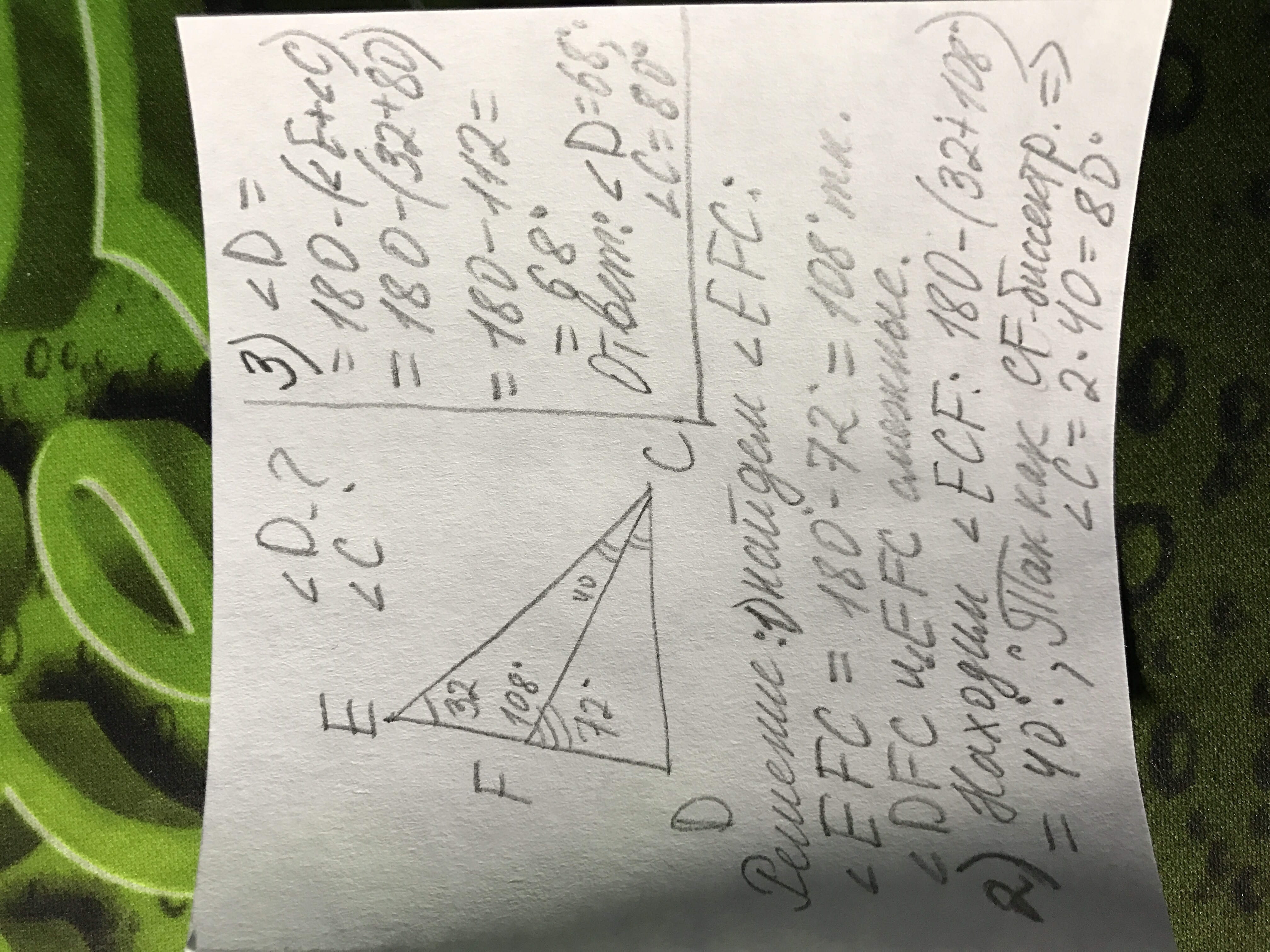 Дам 50 баллов!Отмечу ответ лучшим!В треугольнике CDE с углом E равным 32 градуса, проведена биссектриса CF, угол CFD равен 72 градуса.Найдите угол D.
