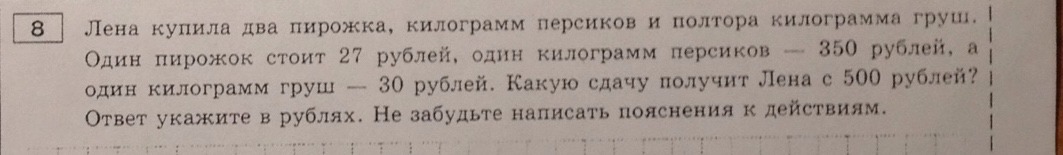Ш купила два пирожка килограмм персиков и полтора килограмма груш | Один пирожок стоит 27 рублей один килограмм персиков 350 рублей ‘ один килограмм груш — 30 рублей Какую сдачу получит Лена с 500 рублей } ‘ Ответ укажите в рублях Не забудьте написать пояснения к действиям :