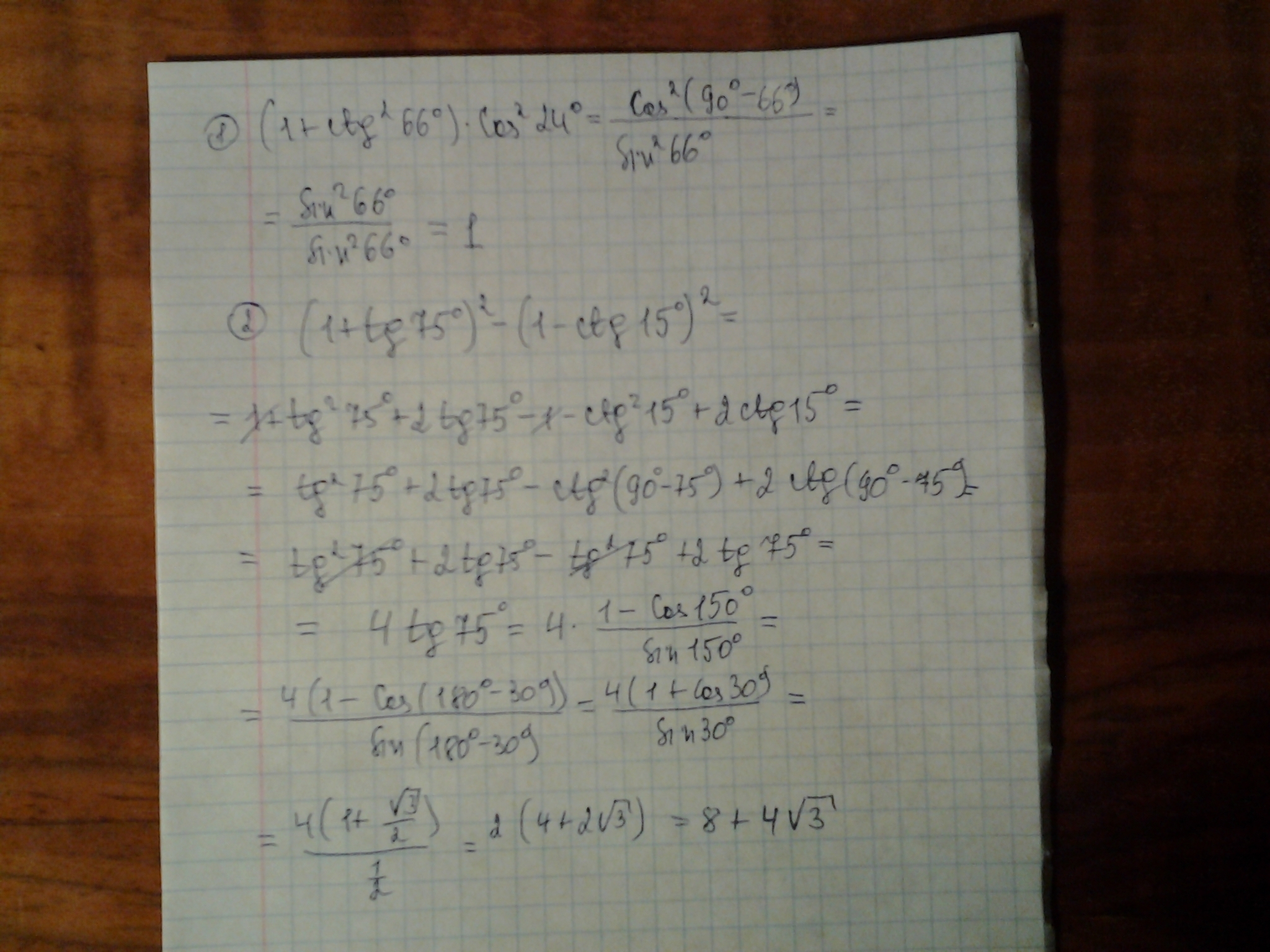 (1 + cot^2 66 градусов)× cos^2 24градусов
