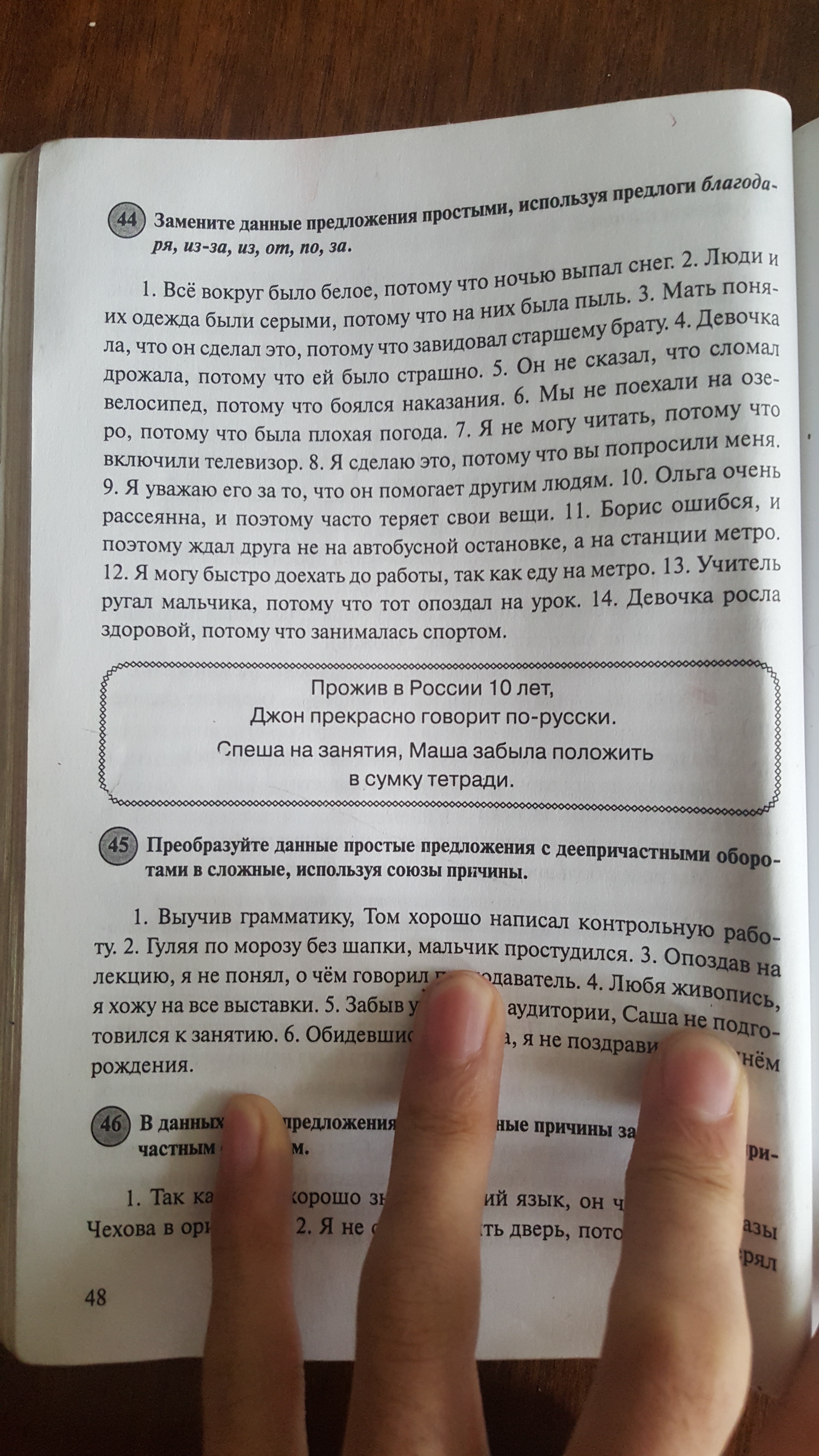 Все вокруг было белое благодаря выпавшему ночью снегу. Люди и их одежда были серыми из-за пыли. Мать поняла, что он сделал это из зависти к старшему брату. Девочка дрожала от страха. Он не сказал о сломанном велосипеде из-за боязни наказания. Мы не поехали на озеро из-за плохой погоды. Я не могу читать из-за включенного телевизора. Я сделаю это по вашей просьбе. Я уважаю его за помощь другим людям. Ольга по рассеянности часто теряет свои вещи. Борис по ошибке ждал друга не на автобусной остановке, а на станции метро. Я могу быстро доехать до работы благодаря метро. Учитель ругал мальчика за опоздание на урок. Девочка росла здоровой благодаря занятиям физкультурой.