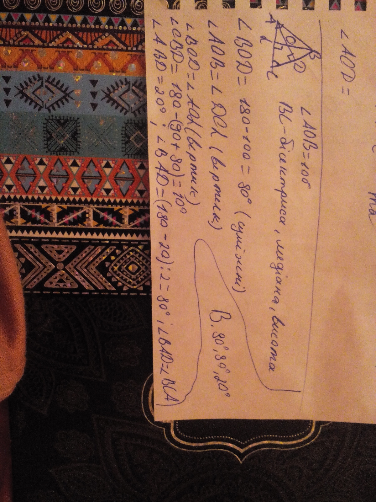 в равнобедренном треугольнике авс с основанием ас из вершин а и в проведены биссектрисы, образующие при пересечение угол 100 градусов. Найдите углы треугольника