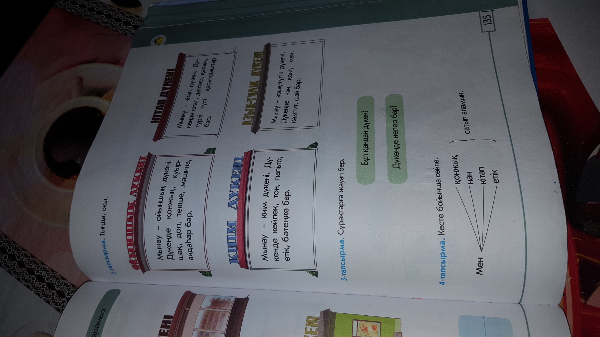 - бұл жерде дүкендер көп олар : азық - түлік дүкені , киім дүкені , кітап дүкені, ойыншық дүкені