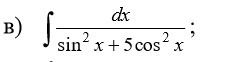 2); ; int  frac{dx}{sin^2x+5cos^2x} =Big [frac{:cos^2x}{:cos^2x}Big ]=int frac{frac{dx}{cos^2x}}{tg^2x+5} =int  frac{d(tgx)}{tg^2x+5} =[t=tgx]=\\=int  frac{dt}{t^2+5} =frac{1}{sqrt5}cdot arctgfrac{t}{sqrt5}+C= frac{1}{sqrt5}cdot  arctgfrac{tgx}{sqrt5} +C