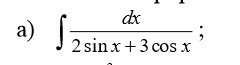 1); ; int  frac{dx}{2sinx+3cosx}=[; t=tgfrac{x}{2}; ,; sinx=frac{2t}{1+t^2}; ,; cosx=frac{1-t^2}{1+t^2} ; ,\\dx=frac{2, dt}{1+t^2}; ]=int  frac{2, dt}{(1+t^2)cdot (2cdot  frac{2t}{1+t^2}+3cdot frac{1-t^2}{1+t^2}) } =int  frac{2, dt}{4t+3-3t^2} =\\=-frac{2}{3}cdot int  frac{dt}{t^2-frac{4}{3}t-1} =- frac{2}{3} cdot int  frac{dt}{(t-frac{2}{3})^2-frac{4}{9}-1} =- frac{2}{3} cdot int frac{dt}{(t-frac{2}{3})^2-frac{13}{9}} =