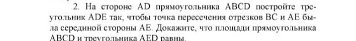 На стороне AD прямоугольника ABCD постройте треугольник АDЕ так, чтобы точка пересечения отрезков ВС и АЕ была серединой стороны АЕ. Докажите, что площади прямоугольника ABCD и треугольника AED равны.