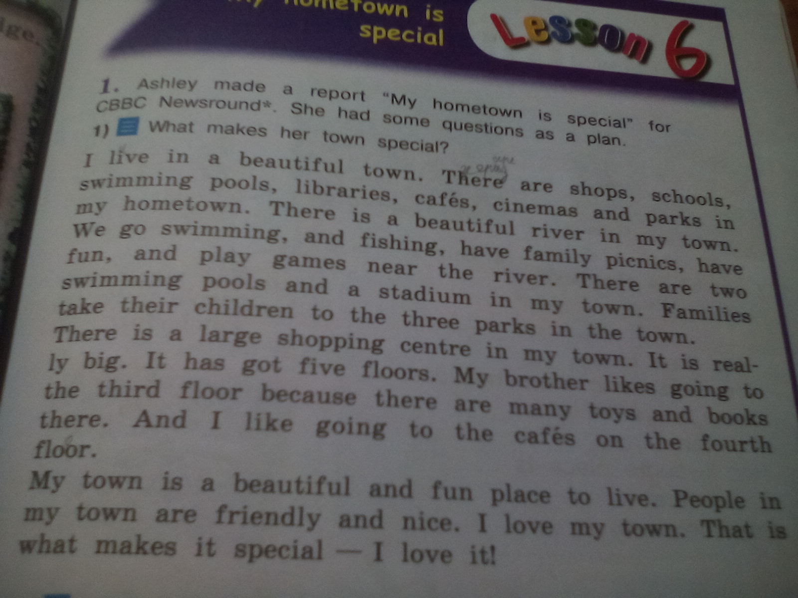 Май таун из э бьютифул энд ван плэйс ту лив .Пипл ин май таун аре френдли энд найс .Ай лов май таун.Зэт из вот мэйкс ит спешл- ай лов ит!