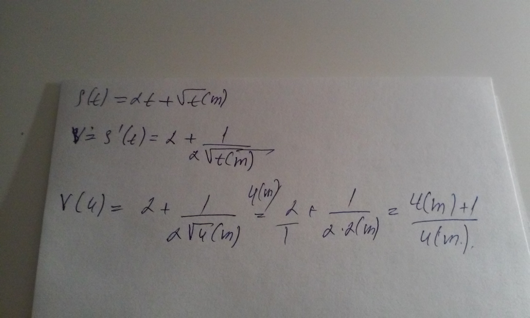 материальная точка движение прямолинейно по закону S(t)=2t+√t(m)найдите скорость точки в момент времени t=4c