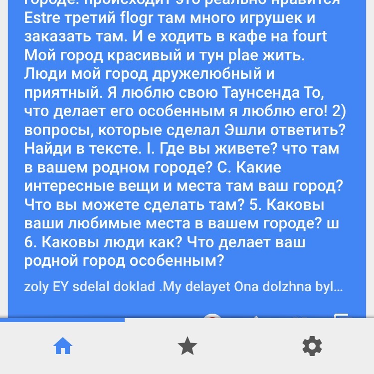 Я живу в прекрасном городе. Тут есть магазины, школы, бассейны, библиотеки, кафе, кинотеатры и парки в моем родном городе. Мы идем на плавание, и рыбалку, на семейные пикники, весело проводим время, и играем в игры на берегу реки. Ещё есть два бассейна и стадиона в моем городе. Семьи берут своих детей к трем паркам в городе. Существует большой торговый центр в моем городе. Он действительно большой. Имеет пять этажей. Мой брат любит ходить на третий этаж, потому что там есть много игрушек и книг. И я люблю ходить к АФЕС на четвертом этаже. Мой город —красивое и забавное место, для жительства. Мой город дружелюбный и приятный. Я люблю свой город. То, что делает его особенным — я люблю его.