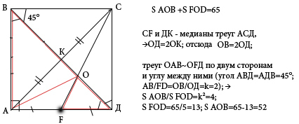 точка F середина стороны AD квадрата ABCD , O=BD CF вычеслите площади треугольников AOB И FOD если их сумма равна 65см2