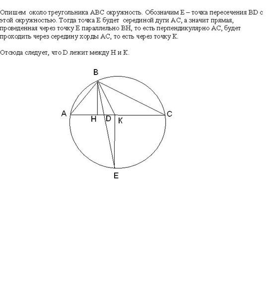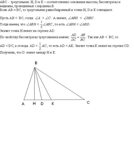 докажите, что в произвольном треугольнике биссектриса лежит между медианой и высотой, проведенными из той же вершины.