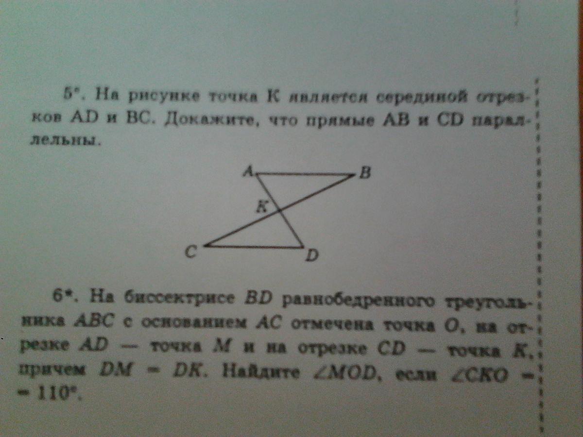 6.Угол ДКО= 180-110 =70 гр.; угол ОМД= 70 гр.(т.к. МД=ДК); угол МОК= 180-70-70= 40 гр.: угол МОД = 40 :2 =20 гр. (т.к.ОД является биссектриссой.