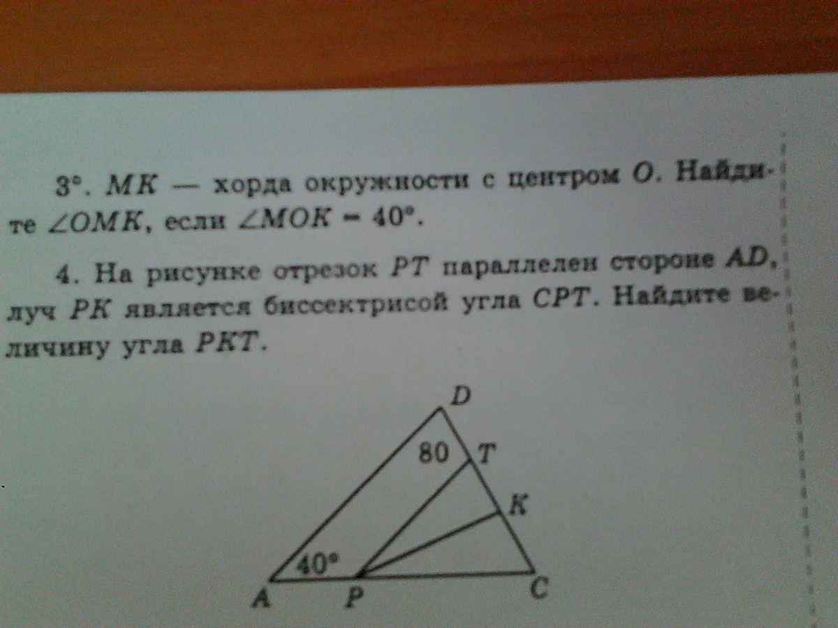 4. Угол РТС = 80 гр. Угол ТРС = 40 гр ( как соответственные углы при параллельных прямых и секущей).угол ТРС = 40:2 = 20 гр. Угол РКТ = 180- 20- 80 = 80 гр.