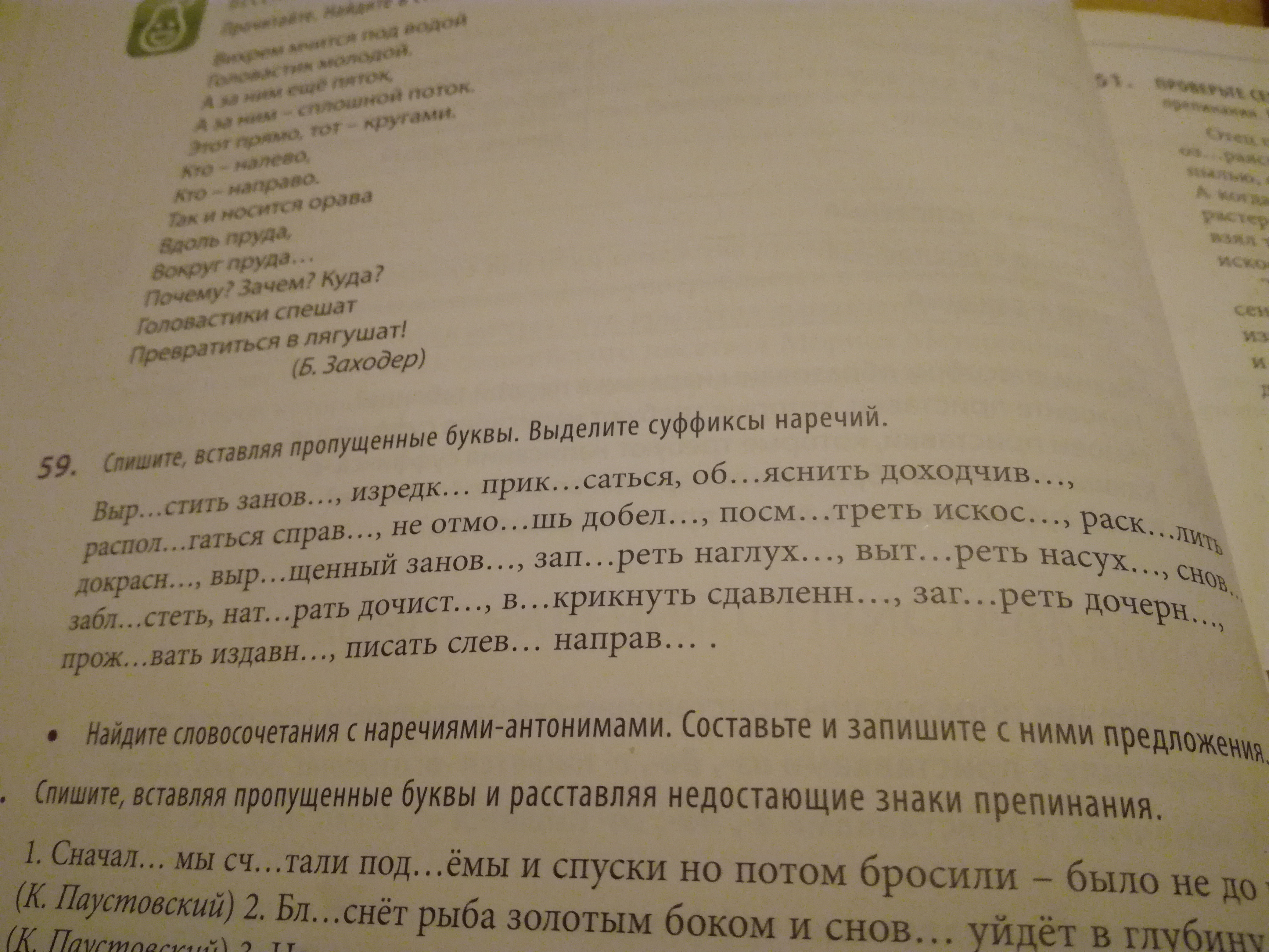 Вырастить заново,изредка прикасаться,, объяснить доходчиво,распологаться справа,не отмоешь добела,посмотреть искоса,раскалить докрасна,выращенный заново,запереть наглухо,вытереть насухо,снова заблестеть,натирать дочиста,вскрикнуть сдавленно,загореть дочерна,проживать издавна,писать слева направо