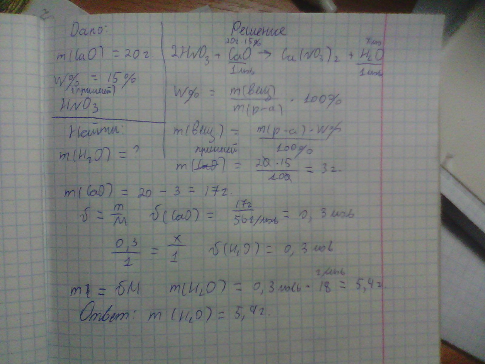 Какая масса воды образуется при взаимодействии азотной кислоты с 20г. оксида кальция содержащего 15% примесей?