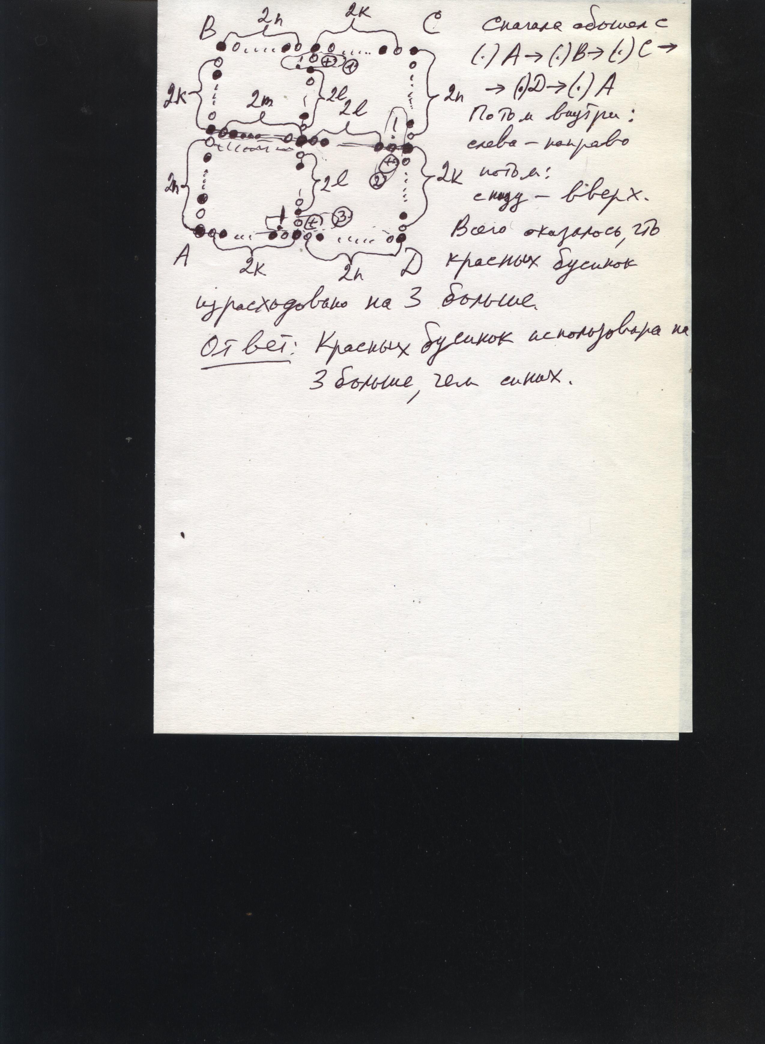 Из синих и красных маленьких бусинок Катя сплела большой узор, представляющий из себя квадрат 110×110 с внутренними линиями. Известно, что каждая синяя бусина касается только красных и наоборот (каждая красная касается только синих), и при этом все узлы (пересечения внутренних линий друг с другом и пересечения внутренних линий со сторонами) и все вершины квадрата оказались синими бусинками. На сколько больше было использовано красных бусинок, чем синих?