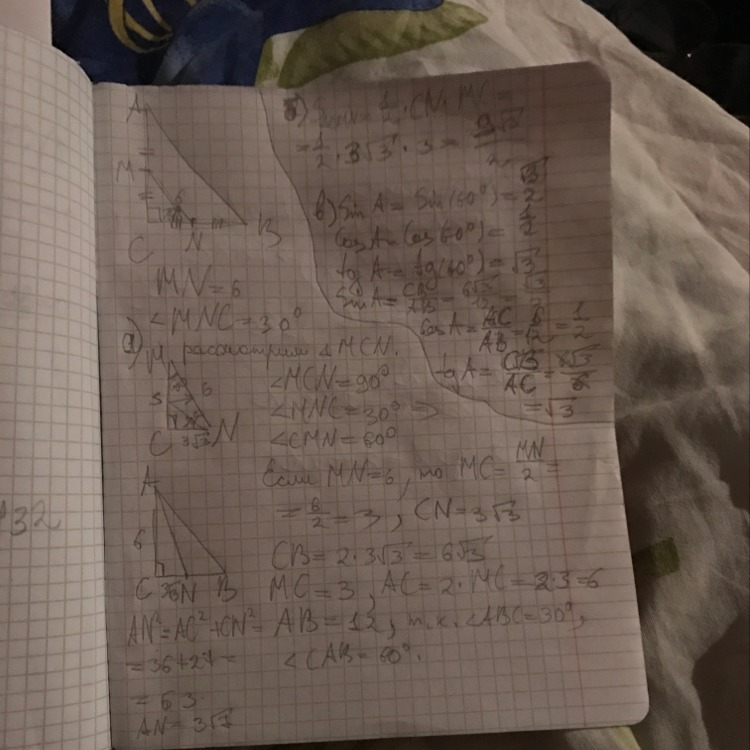 в прямоугольном треугольнике ABC угол C=90 градусов, M-середина AC, N-Середина BC, MN=6 см, угол MNC=30 градусам