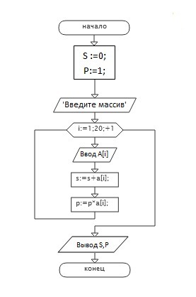 Помогите пожалуйста. Задача написать программу на паскале и к ней блок схем объясняющий её, с пояснениями. "Найти Сумму и произведение элементов одномерного массива. В массиве 20 чисел"