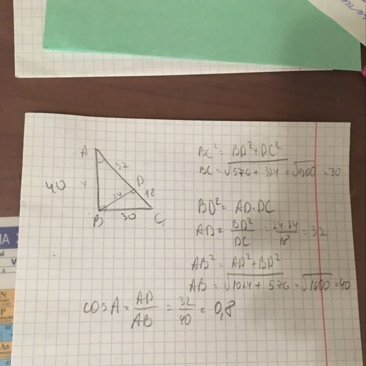 В прямоугольном треугольнике ABC высота BD равна 24 см и отсекает от гипотенузы AC отрезок DС, равный 18 см. Найти AB и cos A