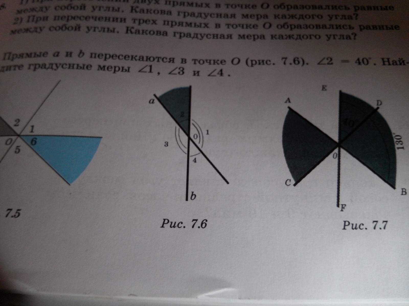 прямые а и b пересекаются в точке О(рис. 7.6).Угол 2=40градусов .Найдите градусные меры угол 1, угол 3 и угол 4.