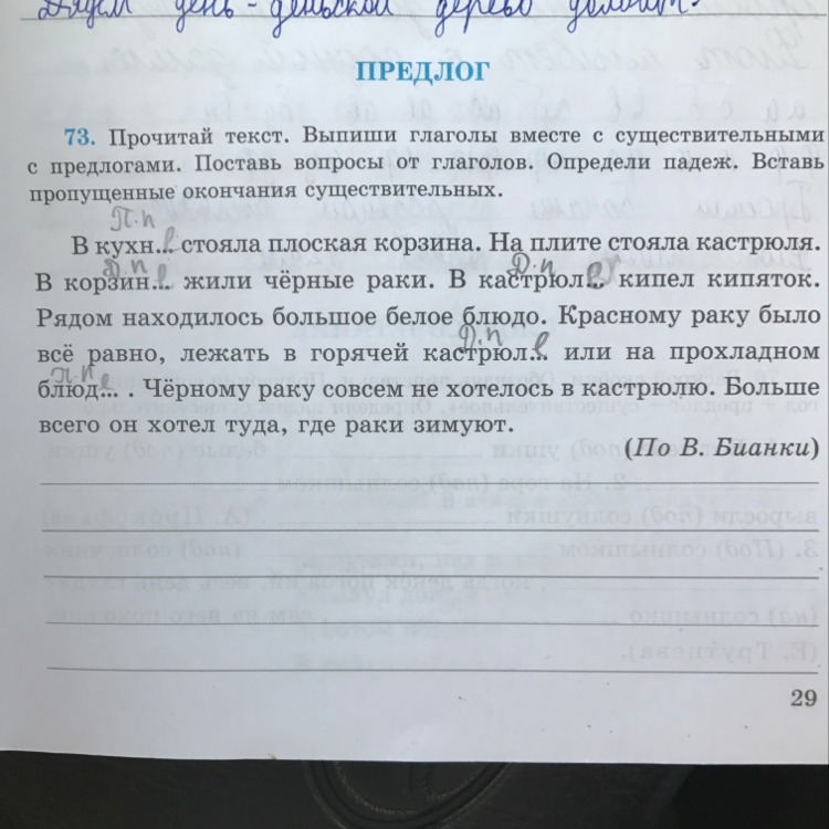 Прочитай. Выпиши глаголы вместе с сущиствительными с предлогами. Поставь вопросы от глаголов. Определи падеж. Вставь пропущенные окончания существительных. В кухне.. стояла плоская корзина. На плите стояла кастрюля. В корзине жили чёрные раки. В кастрюле кипел кипяток. Рядом находилось большое белое блюдо. Красному раку было все равно, лежать в горячей костр