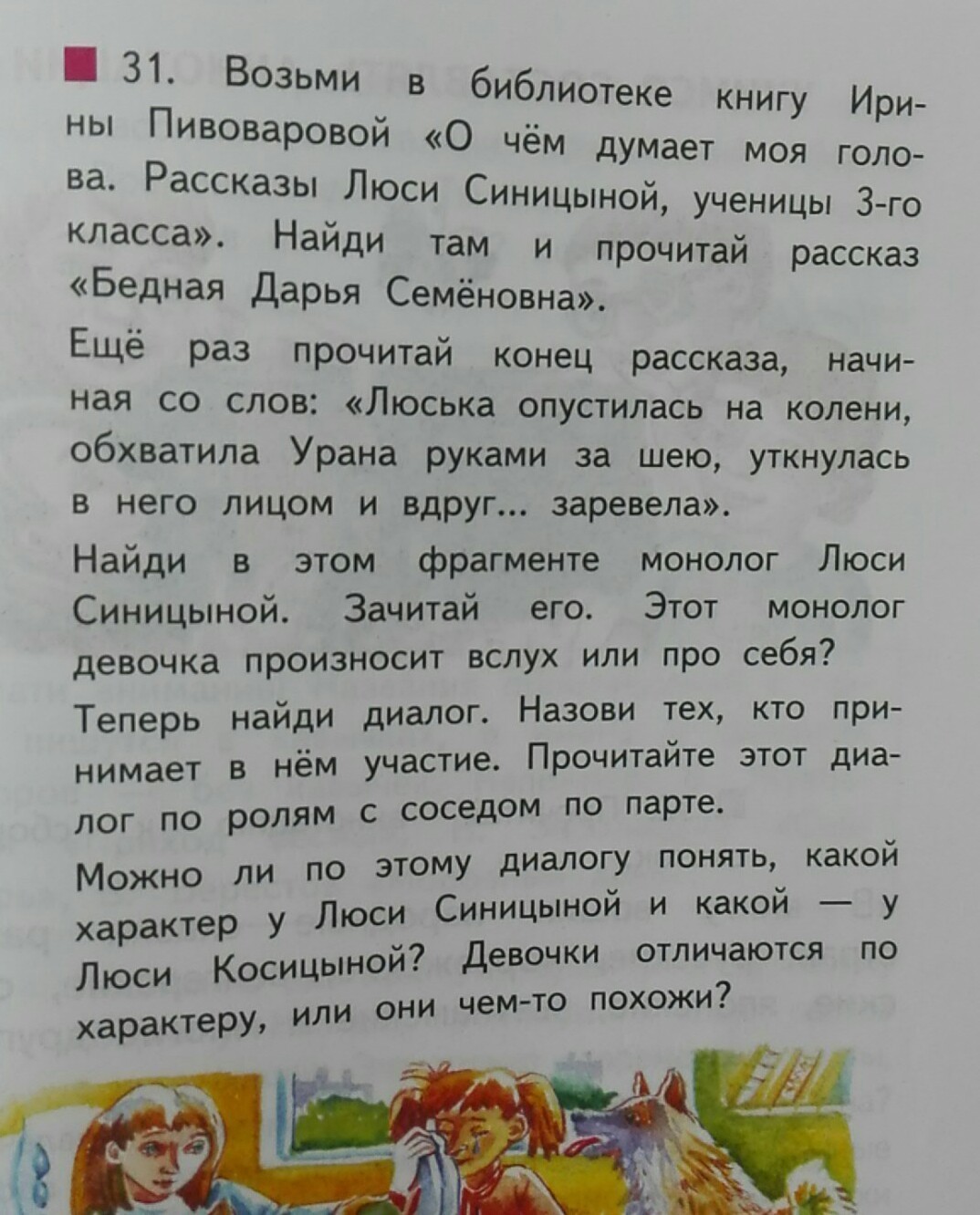 Монолог Люся Синицына произносит про себя. Монолог происходит между двумя Люсями. Девочки по характеру разные, но у них есть похожие черты: доброта и неравнодушие, дружелюбие и щедрость.