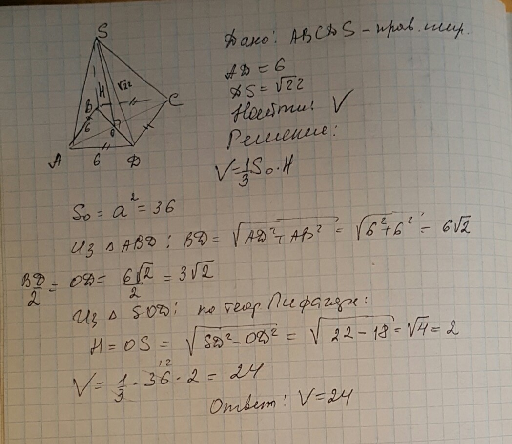 . Найдите объём правильной четырёхугольной пирамиды, сторона основания которой равна 6, а боковое ребро равно √22 .