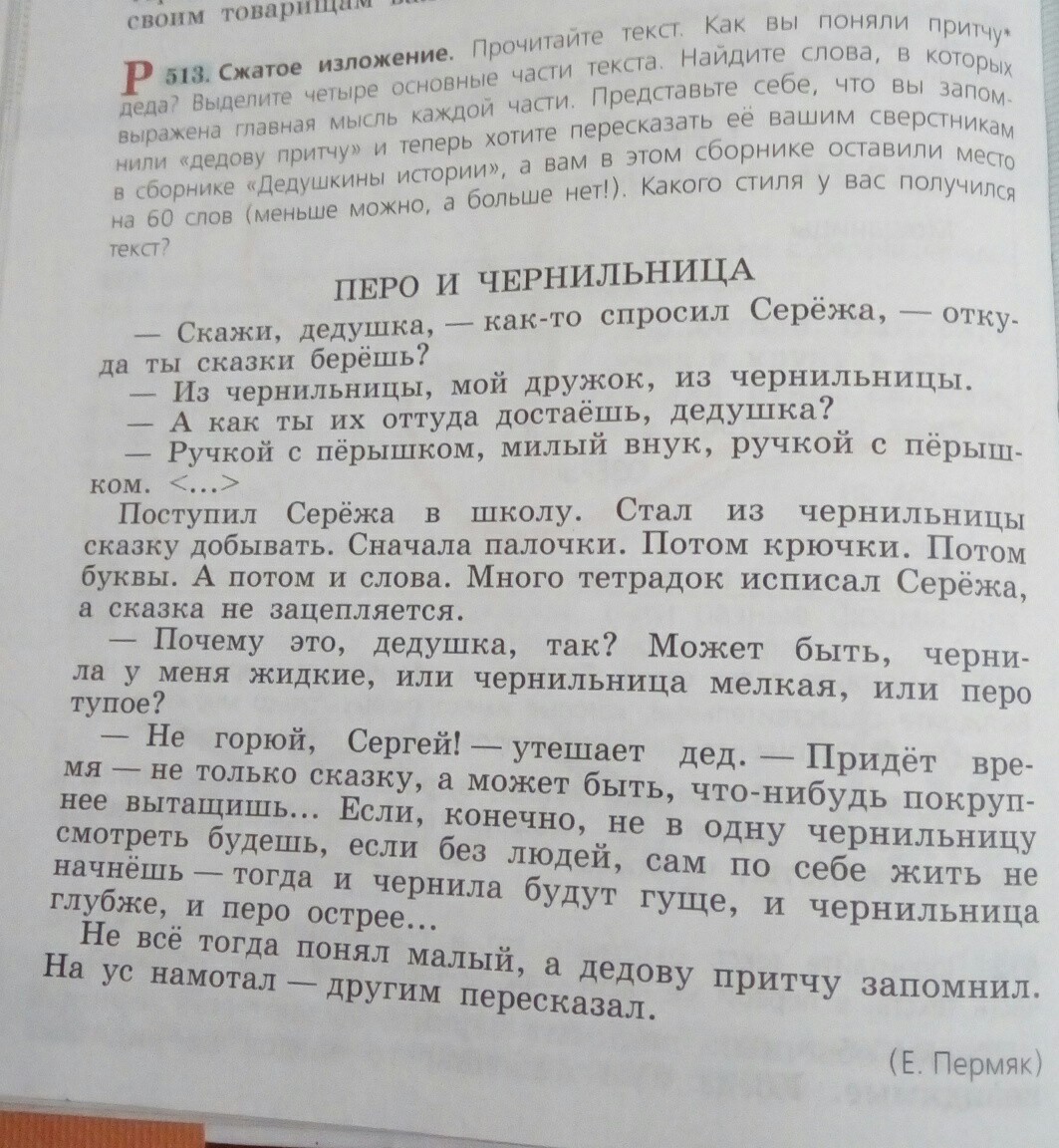 -Скажи, дедушка,-как-то спросил Серёжа- откуда ты сказки берёшь? -Мой милый внук, из чернильницы. -А как ты их оттуда достаёшь, дедушка? -Мой милый внучок, с ручкой с пёрышком. Пошёл Серёжа в школу. Стал из чернильницы сказку добывать, писать. Палочки, крючки, буквы. А потом же слова. Много тетрадок испортил Серёжка, а сказку не может написать. -Дедушка почему у меня не получается? Может у меня чернила, чернильница или перо плохие. -Не горюй, малыш!- утешает внука, дед-Придет время, и ты напишешь по-крупнее сказки. Запомнил внук слова дедушки.