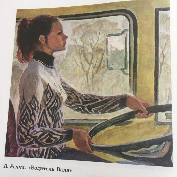 На картине,, Водитель Валя,, изображено, как женщина по имени Валя - водит автобус. Сама женщина одета в белый свитер с чёрными узорами. Взгляд её сосредоточен прямо на дороге. По её взгляду можно понять, что она очень смелая и серьёзная. Её волосы собраны в хвост, чтобы они не мешали Вале работать. В автобусе очень большие окна. Можно в них увидеть деревья, на которых желает листья. Значит наступает осень.