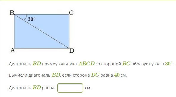 Диагональ BD прямоугольника ABCD со стороной BC образует угол в 30°.