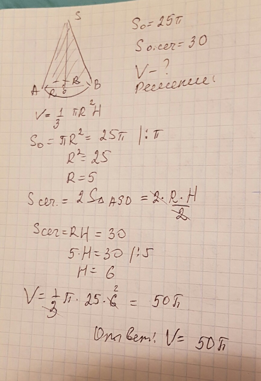 Площадь осевого сечения конуса равна 30 а площадь его основания 25пи. найдите обьем конуса