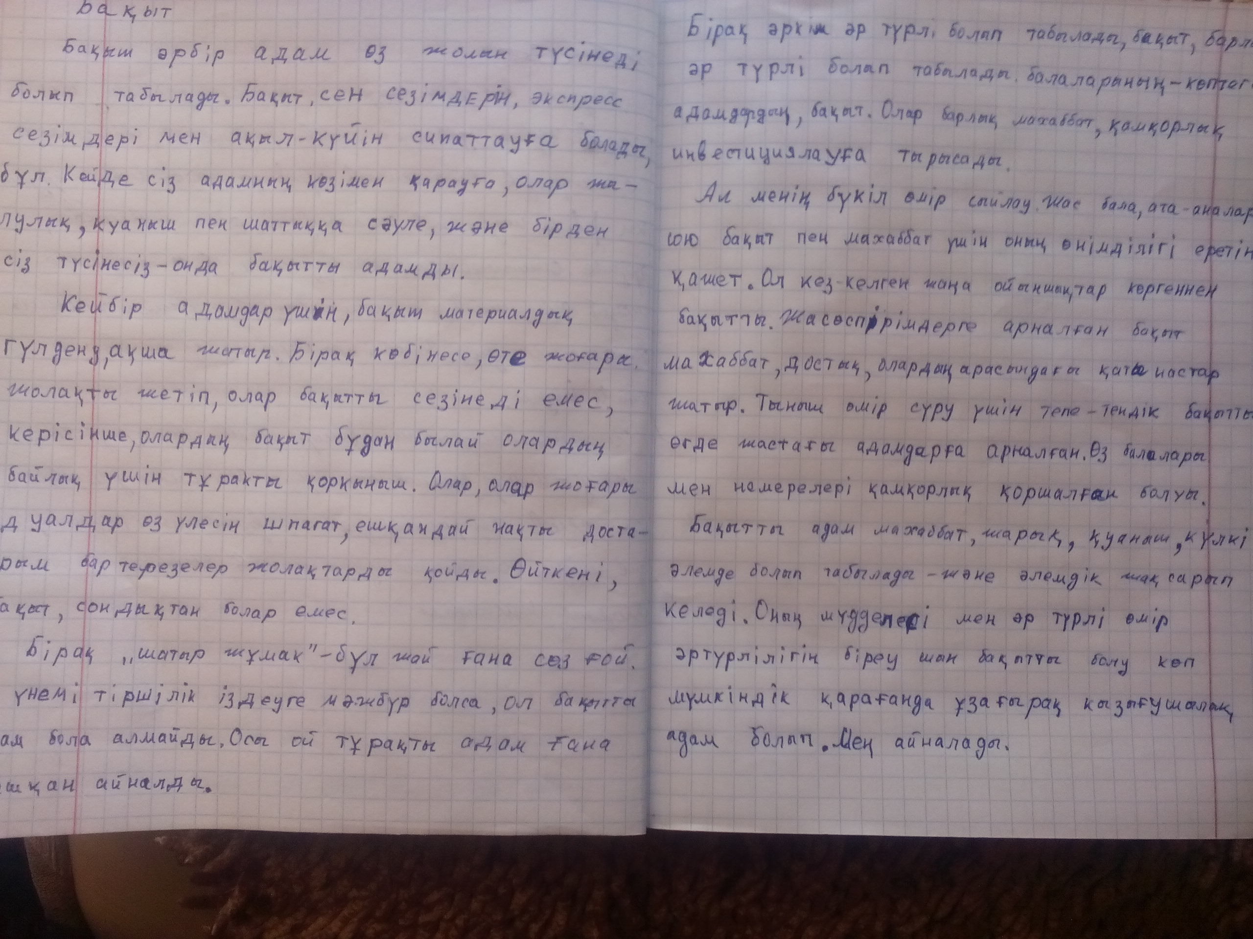 Для одних людей счастье заключается в деньгах, в материальном благополучии. Но часто, достигнув какой-то очень высокой планки они не ощущают счастья, а наоборот, их счастье перерастают постоянный страх за своё богатство. У них нет настоящих друзей, они обносят свои дома высокими заборами, ставят решётки на окна. Ведь счастье не может быть таким.