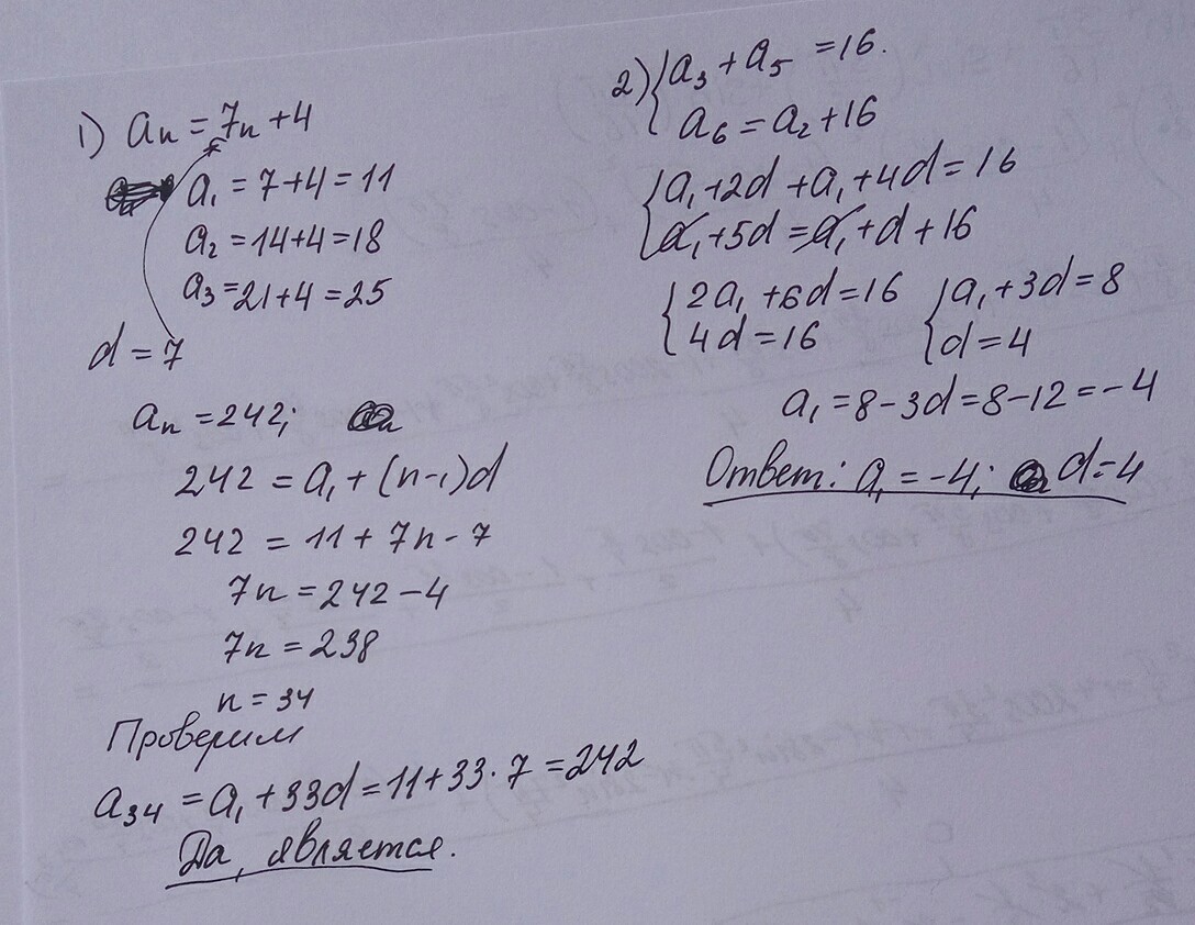 1) Является ли число 242 членом арифметической прогрессии аn=7n+4